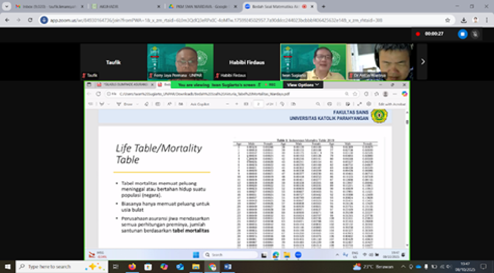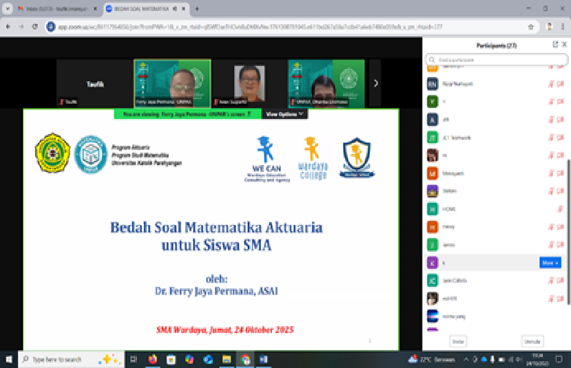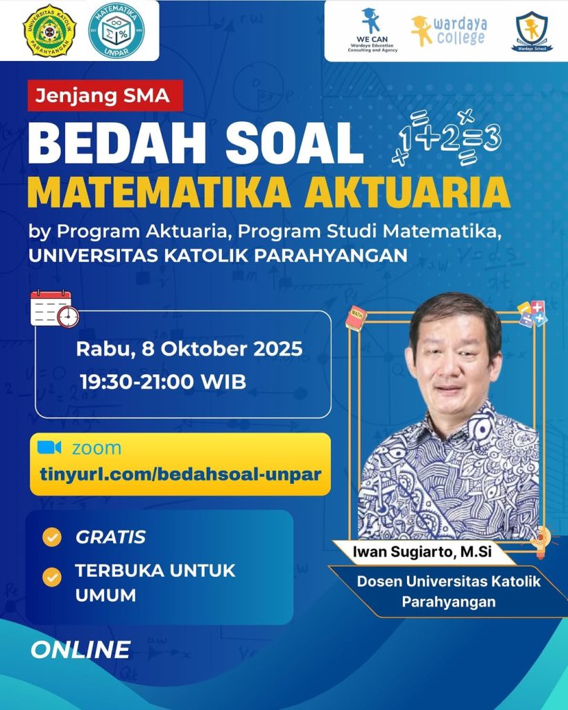 Tim Pengabdian Kepada Masyarakat dari Program Aktuaria, Program Studi Matematika Universitas Katolik Parahyangan menyelenggarakan Bedah Soal Matematika Aktuaria di SMA Wardaya, salah satu sekolah unggulan terbaik di Jakarta. Acara tersebut dilakukan secara online dalam bentuk webinar menggunakan platform zoom. Rangkaian webinar tersebut merupakan kelanjutan webinar yang diselenggarakan pada hari Senin, 10 Maret 2025.