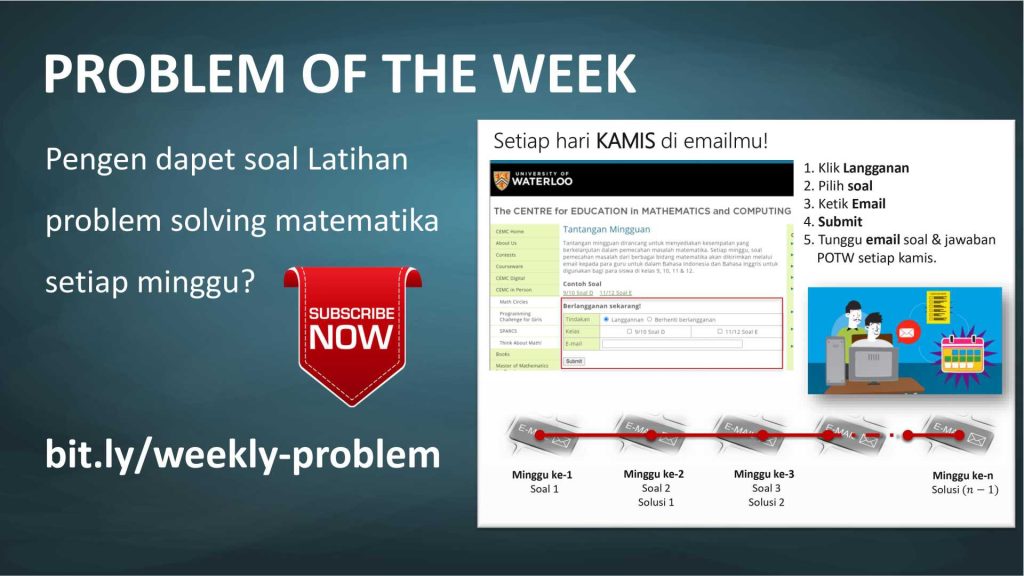 Apakah Anda ingin mendapatkan soal latihan problem solving matematika setiap minggunya? CEMC University of Waterloo menawarkan berlangganan Problem of The Week GRATIS yang berisikan soal problem solving matematika SMA yang dikirimkan ke email setiap hari Kamis. Jawaban soal juga dikirimkan di minggu berikutnya. Soal-soal ini dikirimkan selama tahun ajaran berlangsung. Daftar sekarang di .