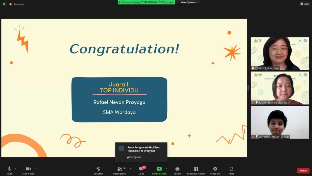 Jurusan Matematika Universitas Katolik Parahyangan (UNPAR) kembali menyelenggarakan acara tahunan Canadian Team Mathematics Contest (CTMC) 2022 pada Sabtu, 21 Mei. Para peserta yang berasal dari 3 pulau di Indonesia mengikuti dengan penuh antusias, walaupun lomba diselenggarakan secara daring melalui platform Zoom. Acara dibuka oleh Dekan Fakultas Teknologi Informasi dan Sains Dr.rer.nat. Ir. Cecilia Esti Nugraheni, S.T., M.T.