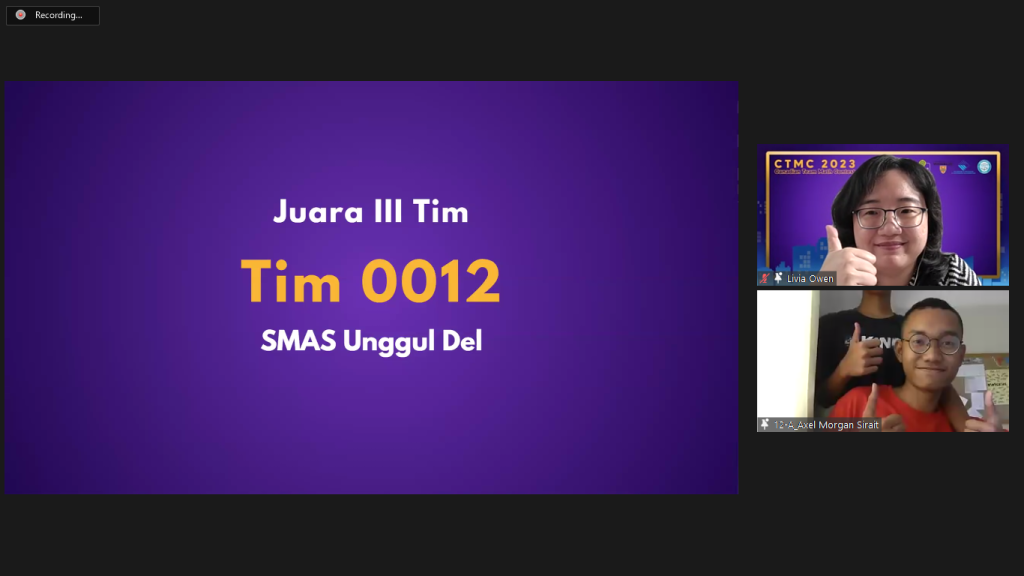 - Juara III Tim: SMAS Unggul Del yang terdiri dari David Amri Christ Siregar, Axel Morgan Sirait, Yavanka Gemayel Saragih, Joel Van Doli Marpaung, Hans Manik, dan Manuel Timothy Silalahi.