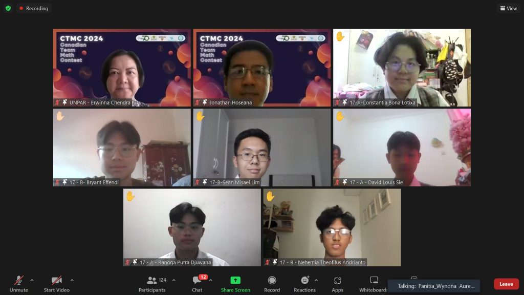 Program Studi Sarjana Matematika Universitas Katolik Parahyangan (UNPAR) kembali menyelenggarakan lomba tahunan tingkat Internasional, yaitu Canadian Team Mathematics Contest (CTMC). Dalam lomba ini, peserta lomba berpartisipasi bentuk tim yang beranggotakan 6 peserta. Soal-soal lomba ini dibuat oleh Centre for Mathematics and Computing (CEMC) University of Waterloo, Kanada. Lomba tersebut diselenggarakan di seluruh dunia, salah satunya di Indonesia. Pada kesempatan tahun ini, UNPAR menyelenggarakan kegiatan ini pada Hari Sabtu, 11 Mei 2024 secara daring melalui platform Zoom.