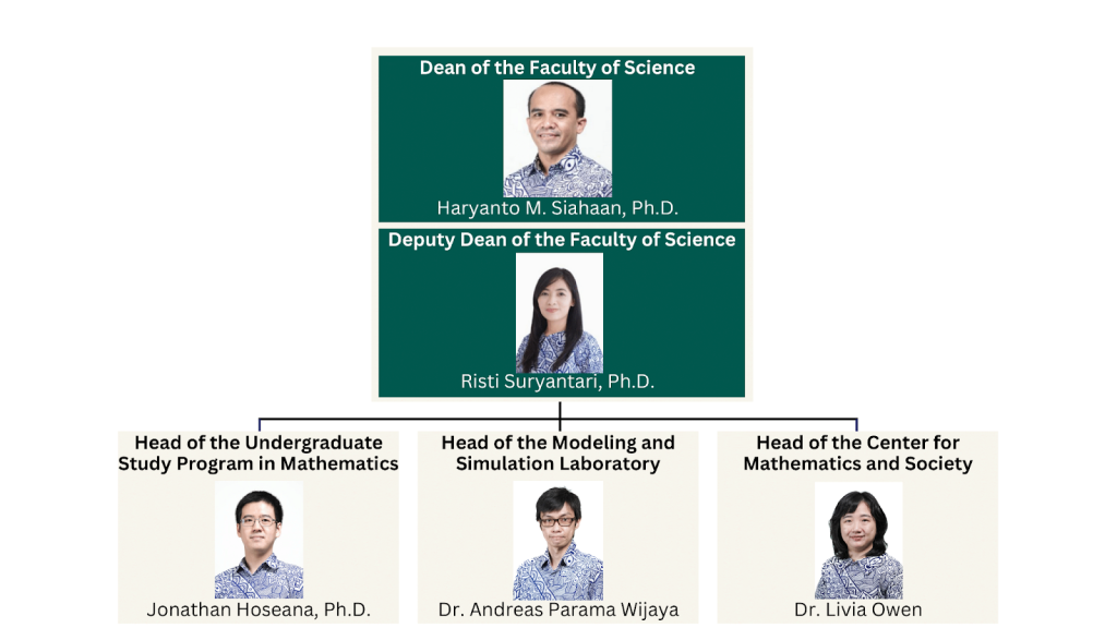 The Undergraduate Mathematics Study Program is managed by the Faculty of Science. The Faculty of Science is led by a Dean, assisted by a Deputy Dean. The Undergraduate Mathematics Study Program is led by the Head of the Undergraduate Mathematics Study Program, who is assisted by the Head of the Center for Mathematics and Society, who is responsible for coordinating research, community service, and publications, as well as the Head of the Modeling and Simulation Laboratory, who is responsible for ensuring the availability and readiness of facilities and infrastructure that support teaching, research, community service, and publications.