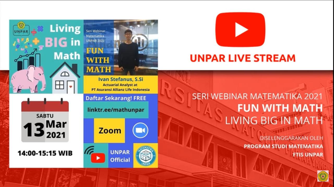 Program Studi Matematika Universitas Katolik Parahyangan (UNPAR) kembali menghadirkan Seri Webinar Matematika dengan tajuk “Fun With Math”. Webinar kedua yang diselenggarakan berjudul “Living Big in Math” dengan pembicara Ivan Stefanus, S.Si pada 13 Maret 2021 melalui platform Zoom.