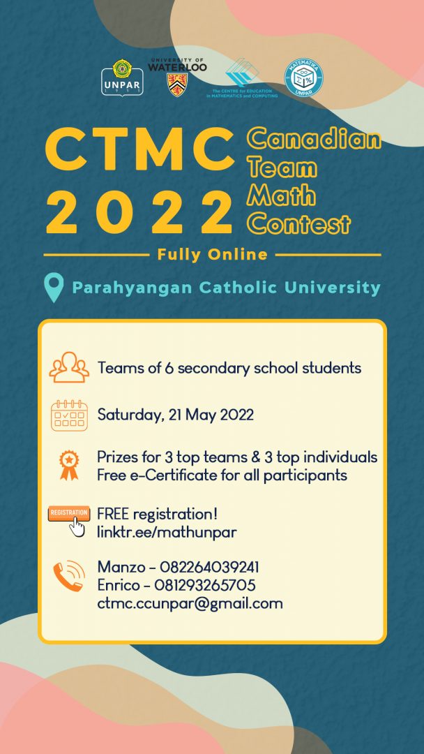 Program Studi Sarjana Matematika Universitas Katolik Parahyangan (UNPAR) kembali menyelenggarakan lomba bertaraf internasional Canadian Team Mathematics Contest (CTMC). Adapun informasi penyelenggaraan lomba ini sebagai berikut.