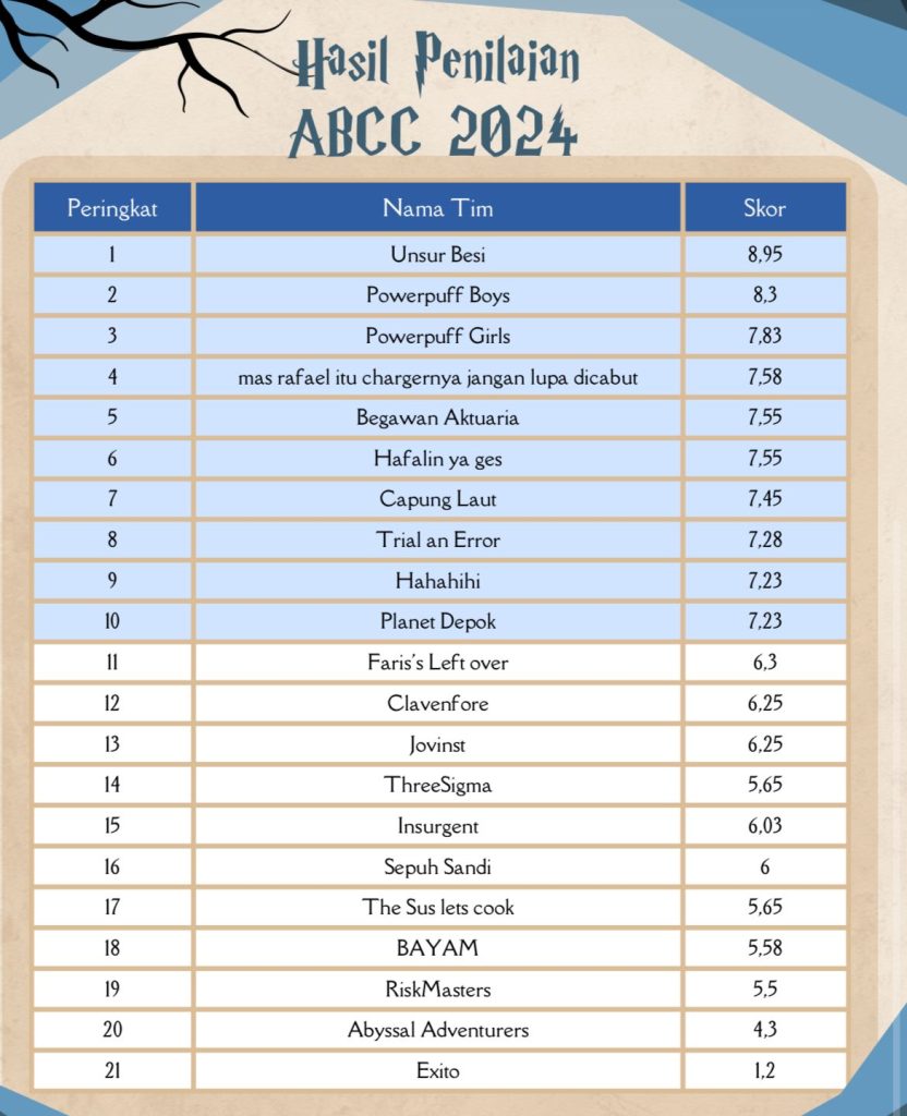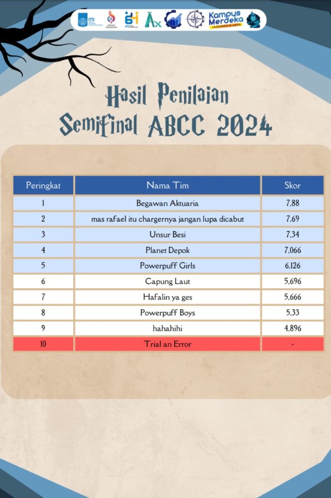 Pada bulan September dan Oktober 2024 yang lalu, Himpunan Mahasiswa Aktuaria Institut Teknologi Sepuluh Nopember (ITS) Surabaya menyelenggarakan Actuarial Business Case Competition (ABCC) 2024 sebagai salah satu kegiatan dalam program Jelajah Aktuaria (JEJAK). Kegiatan ini diselenggarakan sebagai sarana bagi para mahasiswa untuk berkompetisi dan menerapkan ilmu aktuaria yang mereka pelajari di perkuliahan dalam memecahkan permasalahan nyata yang dihadapi suatu perusahaan. Sebagai peserta ABCC 2024 tersebut, Program Studi Sarjana Matematika mendaftarkan dua tim, yaitu Tim Powerpuff Girls, yang terdiri dari Gracia Stephanie (2021), Levana Loanardo (2021), dan Catherine Wijaya (2021), serta Tim Powerpuff Boys, yang terdiri dari Riandy Gladwin (2021), Clifton Stefano Harcen (2021), dan Tang, Yosua Victor Tandy (2021).