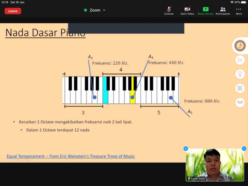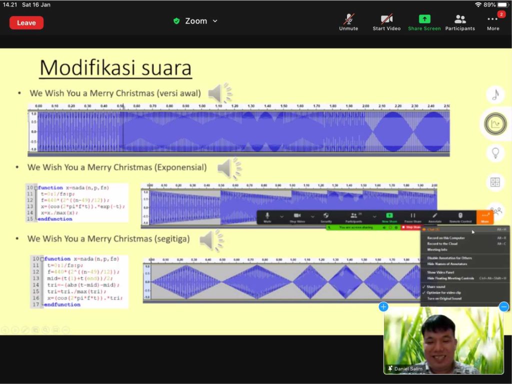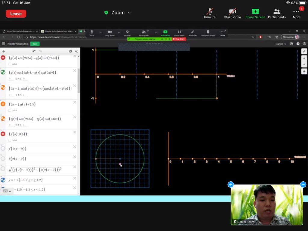 Dalam rangka research fellow yang diikuti oleh salah satu dosen Matematika UNPAR Dr. Daniel Salim, Program Studi Matematika UNPAR memberikan Kuliah Wawasan “Suara, Sinyal, dan Matematika” kepada para mahasiswa Matematika UNPAR. Acara ini diselenggarakan secara daring pada 16 Januari 2021 melalui platform Zoom.