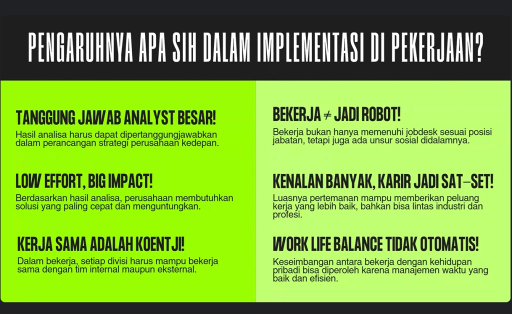 Sebagai contoh implementasi dalam dunia kerja, Gezia menceritakan pengalamannya sebagai Business Performance Analyst di MNC Life serta Management Trainee di ACC. Ia menunjukkan bahwa keterampilan yang diperolehnya selama berorganisasi membantunya beradaptasi dengan cepat di berbagai lingkungan kerja. Kemampuannya dalam membaca dan menganalisis data dengan efektif menjadi keunggulan yang membuatnya mampu memberikan solusi inovatif bagi perusahaan. Selain itu, keterampilan komunikasi yang ia kembangkan selama berorganisasi membantunya dalam bekerja sama dengan berbagai tim lintas divisi. Kuliah tamu ini memberikan wawasan berharga bagi mahasiswa tentang pentingnya mengembangkan keterampilan di luar akademik agar siap menghadapi dunia kerja yang semakin kompetitif. Semoga kuliah tamu ini dapat memberikan insight lebih kepada teman-teman mahasiswa Matematika UNPAR dalam berorgansasi sembari menjalani kehidupan akademik.
