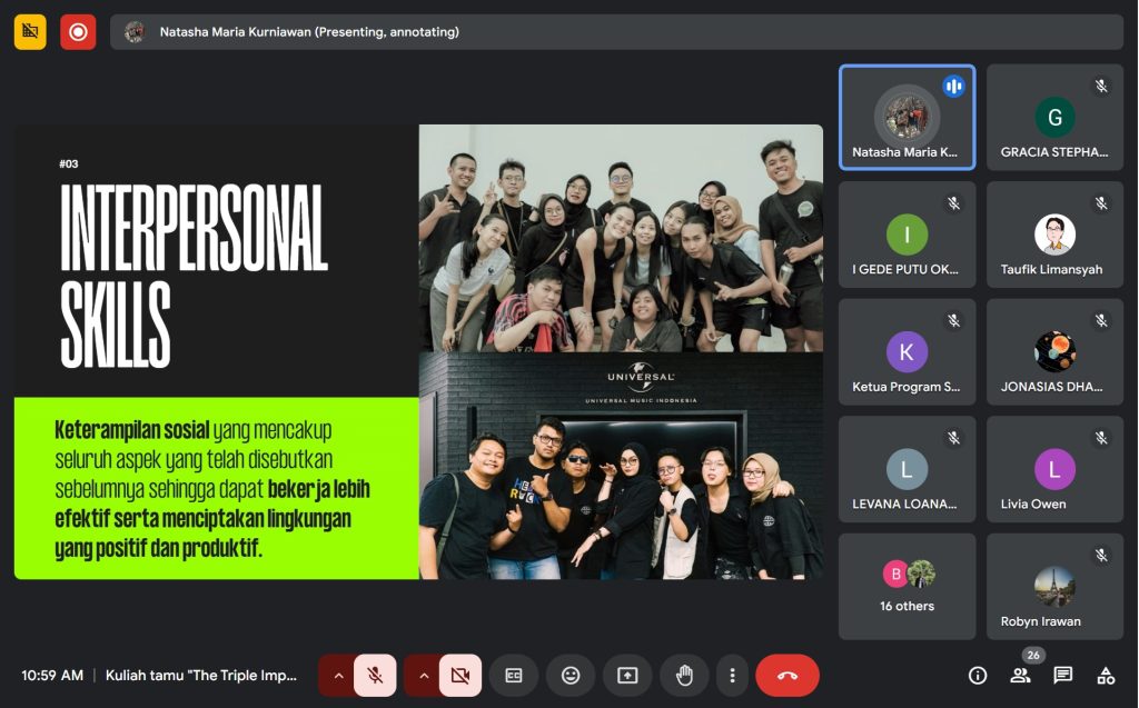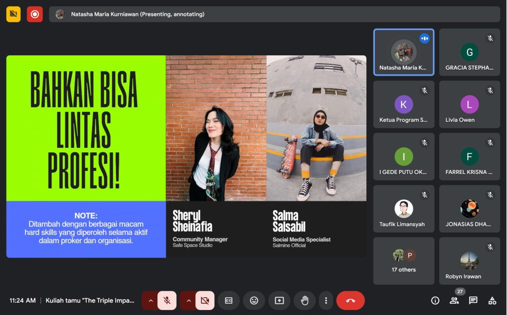Dalam sesi ini, Gezia membagikan pengalaman pribadinya mengenai bagaimana keaktifannya dalam organisasi membantunya meningkatkan keterampilan interpersonal dan kepemimpinan. Ia memperkenalkan konsep “low effort, big impact”, yang menyoroti cara cerdas dalam membagi waktu antara akademik dan kegiatan non-akademik. Dengan pendekatan ini, mahasiswa dapat tetap berprestasi dalam studi tanpa harus mengorbankan kesempatan untuk berkembang di luar kelas. Gezia juga menekankan bahwa pengalaman memegang peran kepemimpinan di organisasi memberikan pelajaran berharga dalam pengambilan keputusan dan manajemen tim. Melalui diskusi yang interaktif, mahasiswa diajak untuk lebih memahami bagaimana peran aktif dalam organisasi dapat membentuk karakter dan kesiapan kerja mereka.