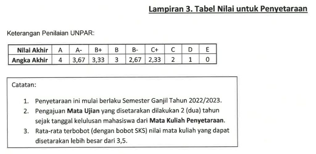 Untuk dapat menyetarakan mata kuliah yang diajarkan di Matematika UNPAR dengan modul ujian PAI, para dosen Matematika UNPAR berupaya menjaga kualitas kurikulum, materi pengajaran, dan soal-soal yang diujikan. Mahasiswa yang berhak memperoleh penyetaraan harus lulus dengan nilai minimum sebesar A- untuk masing-masing mata kuliah. Perjanjian ini mulai berlaku sejak Semester Ganjil 2022/2023 dengan biaya sebesar 500 ribu rupiah per modul ujian. Berikut merupakan tabel penyetaraan mata kuliah di Program Studi Sarjana Matematika UNPAR dengan modul ujian PAI yang disetarakan: