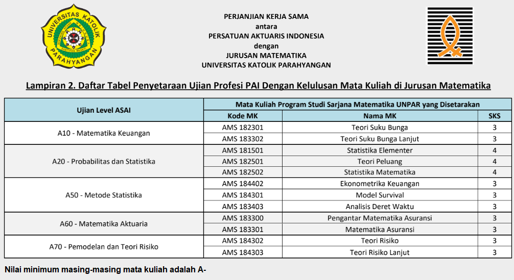 Setelah sebelumnya berhasil menjalin kerjasama dengan Persatuan Aktuaris Indonesia (PAI) terkait penyetaraan beberapa modul ujian PAI, Jurusan Matematika Universitas Katolik Parahyangan (UNPAR) kembali mendapatkan kepercayaan melalui penambahan satu lagi modul ujian PAI, yakni A70 – Pemodelan dan Teori Risiko. Kesepakatan ini dijalin antara PAI dengan UNPAR beserta beberapa perguruan tinggi negeri pada 24 Januari 2023 yang bertempat di Pacific Place, Jakarta Selatan. Nota kesepahaman ditandatangani oleh Ketua PAI Ade Bungsu, FSAI beserta Dekan Fakultas Teknologi Informasi dan Sains (FTIS) UNPAR Dr.rer.nat. Cecilia Nugraheni, sedangkan Perjanjian Kerjasama ditandatangani oleh Ketua PAI dan Ketua Jurusan Matematika UNPAR Dr. Erwinna Chendra.