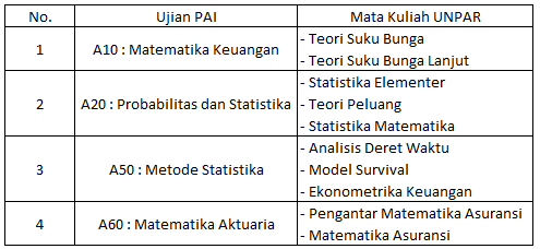Untuk mendapatkan penyetaraan ujian PAI, mahasiswa Matematika UNPAR harus lulus beberapa mata kuliah dengan standar nilai tertentu agar dapat disamakan dengan mata ujian: