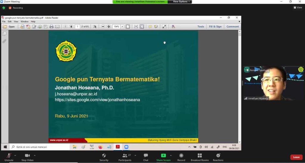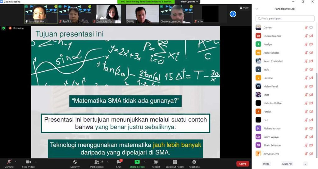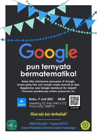 Kegiatan webinar berlangsung melalui Zoom pk. 07.45 – 09.15 dan diikuti oleh sekitar 20 siswa jurusan IPA, beberapa guru SMAK 2 Bina Bakti (Program MATIUS), dan beberapa dosen dari Jurusan Matematika UNPAR. Pembicara dalam webinar ini adalah seorang dosen muda Jurusan Matematika UNPAR yaitu Jonathan Hoseana, Ph.D. Beliau membawakan topik mengenai metode pengurutan laman yang digunakan oleh mesin pencari Google, yang dikenal dengan nama PageRank. Materi matematika dasar yang dipelajari di SMA dan berkaitan dengan topik ini adalah matriks dan peluang. Aplikasi dari metode PageRank ini dalam mengurutkan tim-tim olahraga football di Amerika juga dibahas dalam webinar ini. Di dalam kesempatan ini juga dipaparkan pengenalan program peminatan Aktuaria oleh Dr. Ferry Jaya Permana, ASAI, termasuk prospek kerja bagi lulusannya.