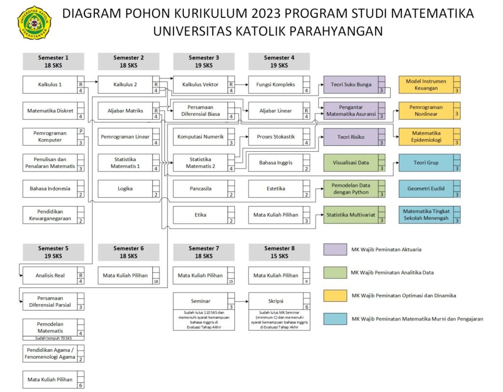 Hubungan keprasyaratan antara mata-mata kuliah dalam Kurikulum 2023 Program Studi Matematika Program Sarjana Universitas Katolik Parahyangan digambarkan menggunakan pohon ilmu berikut ini.