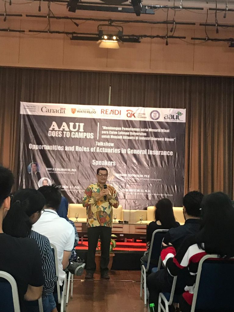 Seminar ini menghadirkan pula beberapa praktisi seperti Bapak Dody A.S. Dalimunthe, MBA yang merupakan Direktur Eksekutif AAUI beserta Bapak Ronny Tanzil, FSAI yang merupakan Appointed Actuary dari Mandiri AXA General Insurance. Dalam seminar tersebut, keduanya memperkenalkan tentang peluang kerja aktuaris dalam dunia asuransi umum beserta dengan kiat-kiat menjadi aktuaris serta tugas dan tanggung jawab aktuaris asuransi umum.