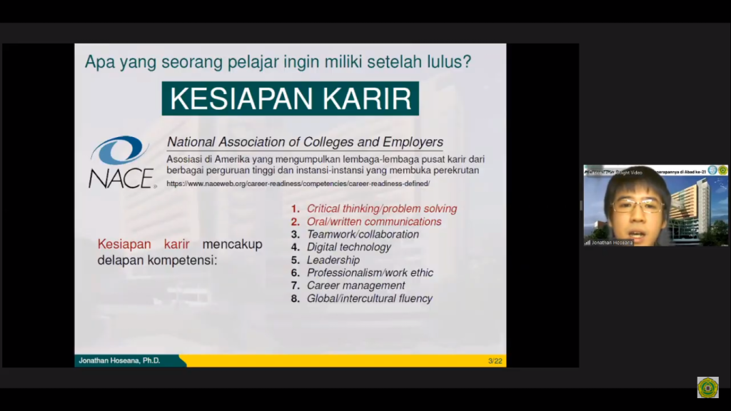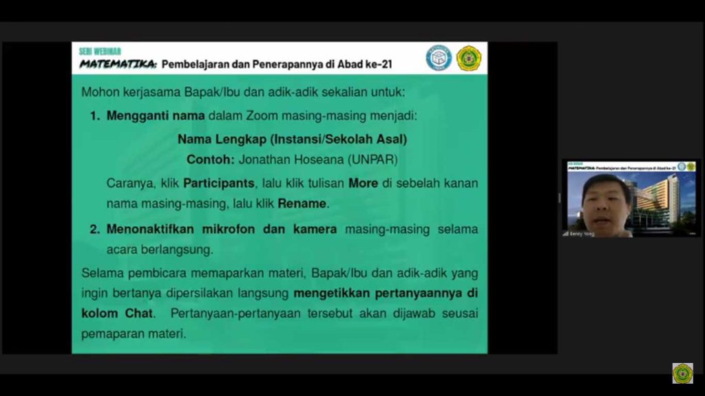 Pada Sabtu, 14 November 2020 pukul 14.00-15.15 WIB melalui platform Zoom, Program Studi Matematika Universitas Katolik Parahyangan menyelenggarakan Seri Webinar III yang berjudul “Mengomunikasikan Matematika dan Mematematikakan Komunikasi” dengan pembicara Jonathan Hoseana, Ph.D. yang merupakan Dosen Matematika UNPAR dan penulis buku-buku olimpiade matematika. Tayangan ulang webinar tersebut dapat disaksikan pada video di atas melalui kanal YouTube UNPAR Official.