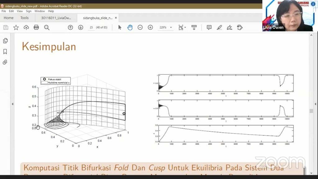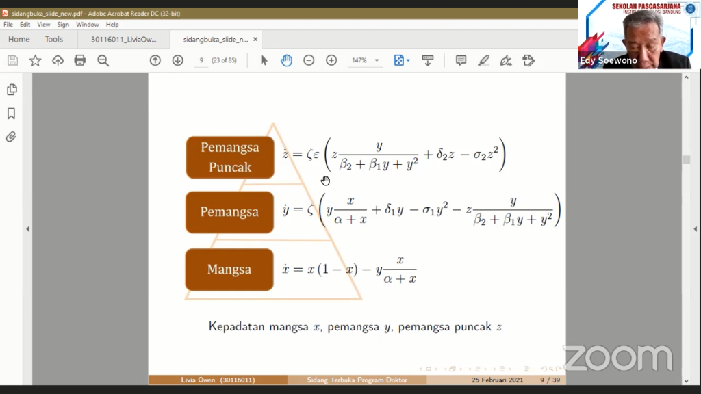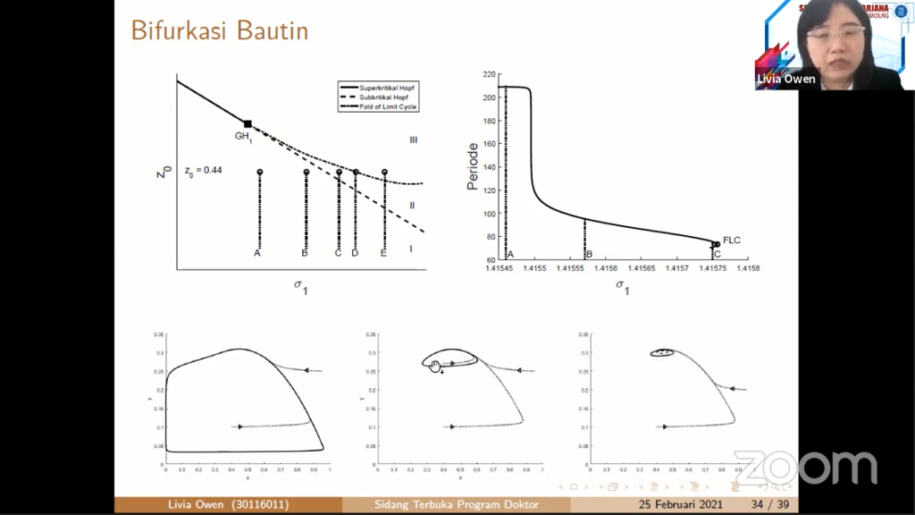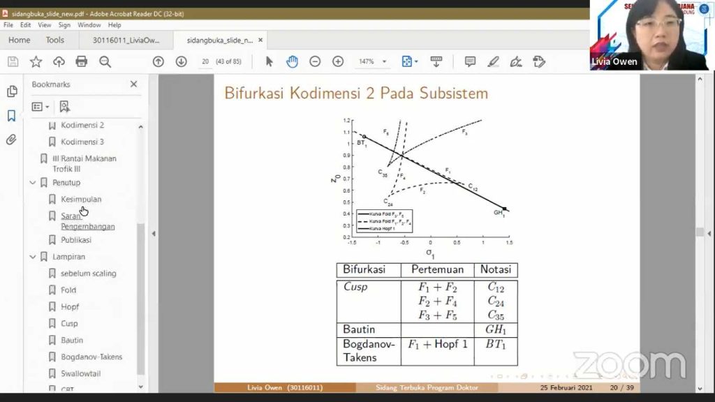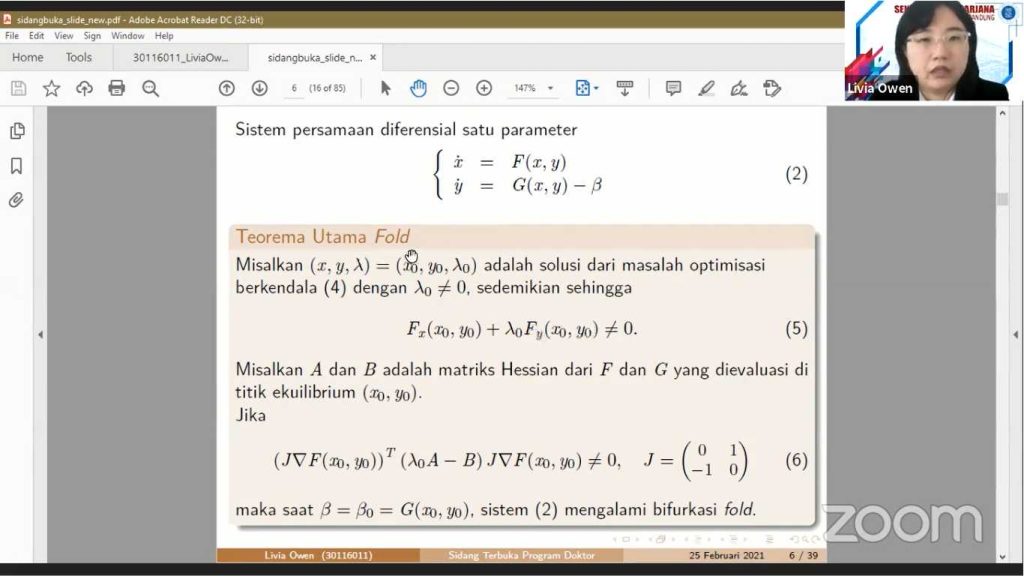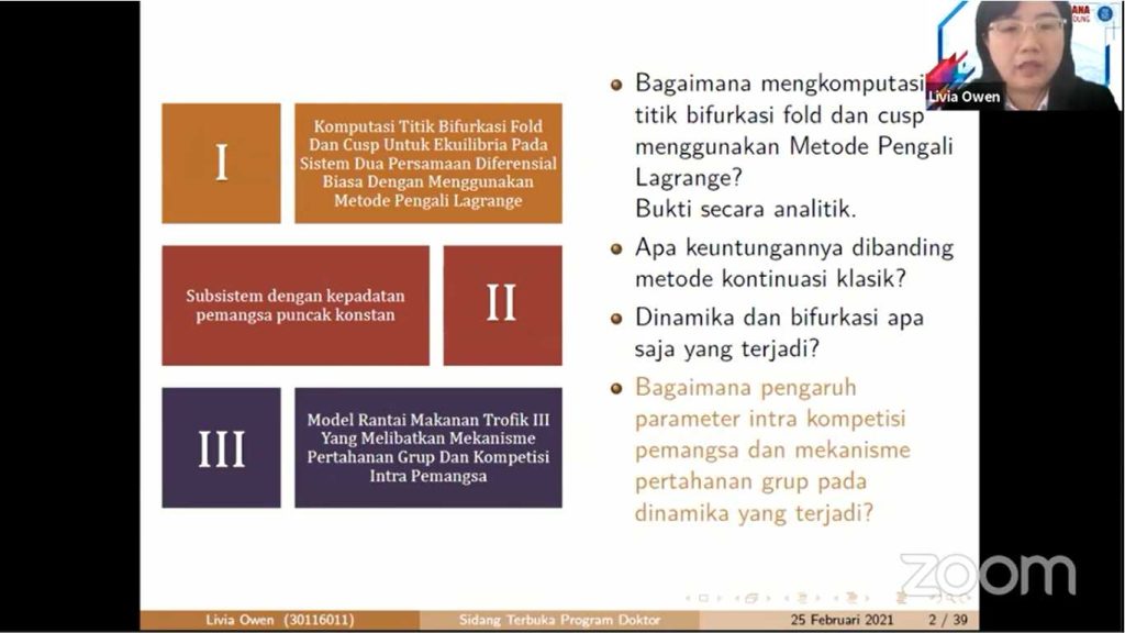 Pada hari Kamis, tanggal 25 Februari 2021, seorang dosen Program Studi Matematika UNPAR, Livia Owen, telah berhasil mempertahankan disertasi Doktoralnya yang berjudul “DINAMIKA DAN BIFURKASI PADA MODEL RANTAI MAKANAN TROFIK III YANG MELIBATKAN MEKANISME PERTAHANAN GRUP DAN KOMPETISI INTRA PEMANGSA” pada Sidang Doktoral yang diselenggarakan secara daring. Tayangan ulang sidang tersebut dapat ditonton pada video di atas.