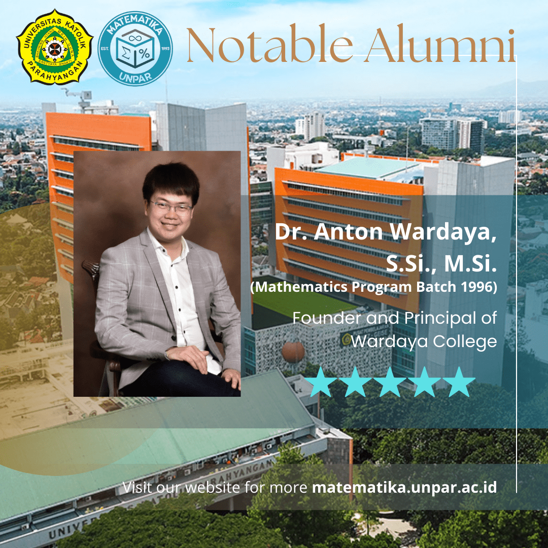“Kuliah di Program Studi Matematika Universitas Katolik Parahyangan mengajarkan saya kemampuan Pemecahan Masalah, Berpikir Kritis dan Kreativitas. Bukan hanya dalam akademik termasuk membangun Bisnis. Dosen yang kompeten dan lingkungan yang sangat mendukung, membuat saya berkembang pesat.”
