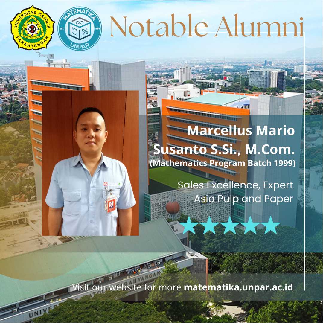 “S1 Matematika UNPAR, secara singkat, telah mengajarkan saya cara berpikir kritis dan logis. Dimana hal tersebut menjadi keterampilan terpenting yang harus dimiliki seseorang. Ini meningkatkan proses berpikir saya, terutama dalam memvalidasi data atau informasi yang saya terima (Cogito, ergo Sum – Rene Descartes)