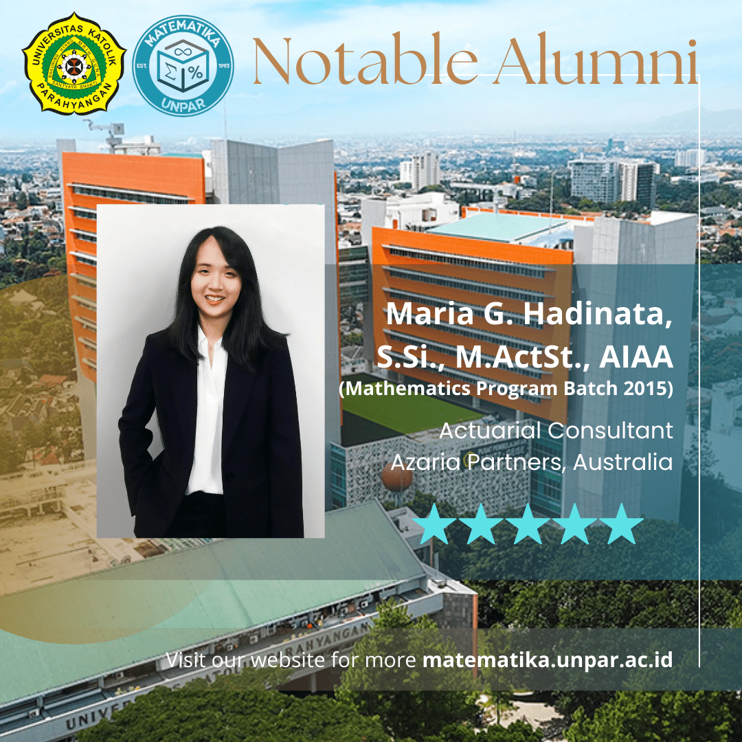 “Kuliah di Program Studi Matematika UNPAR membentuk saya untuk berpikir kritis, sistematis, dan mandiri. Bekal ini sangat membantu ketika saya melanjutkan studi S2 di bidang aktuaria serta dalam menjalani profesi sebagai aktuaris di luar negeri.”