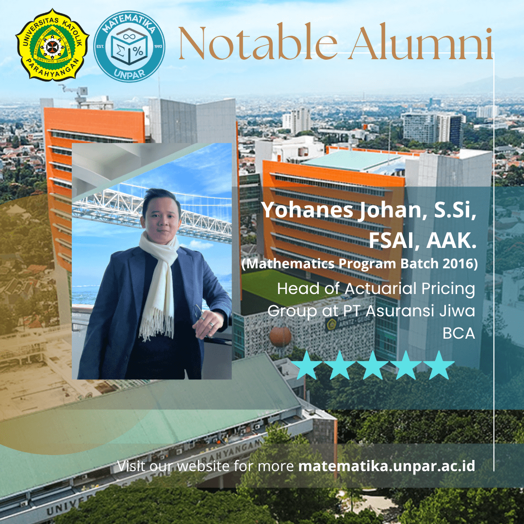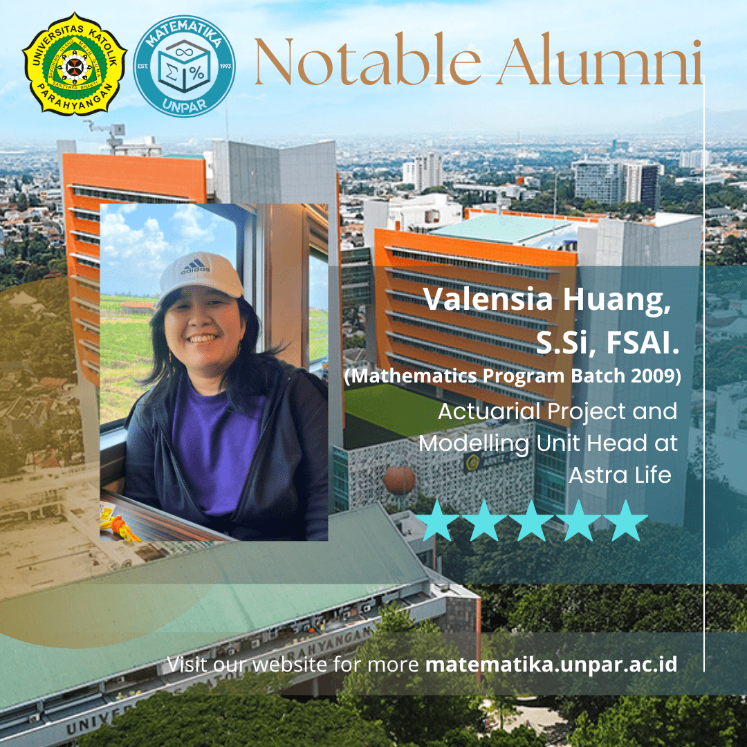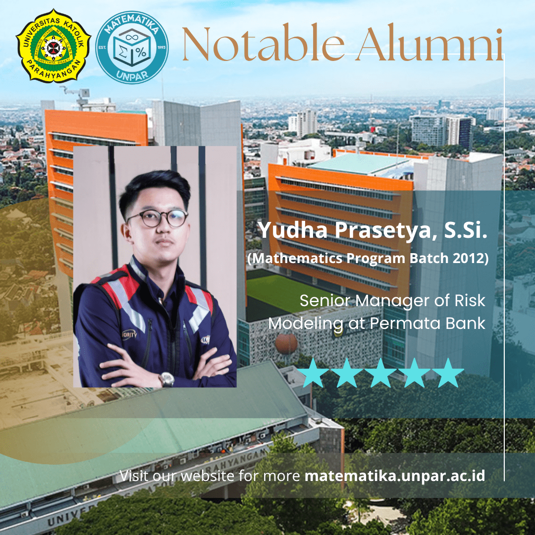 “Kuliah di Matematika UNPAR membuka wawasan saya tentang betapa luasnya penerapan matematika dalam dunia kerja. Salah satunya Matematika Keuangan berbasis risiko, yang menjadi fondasi dalam menunjang pekerjaan saya di sektor Perbankan.”