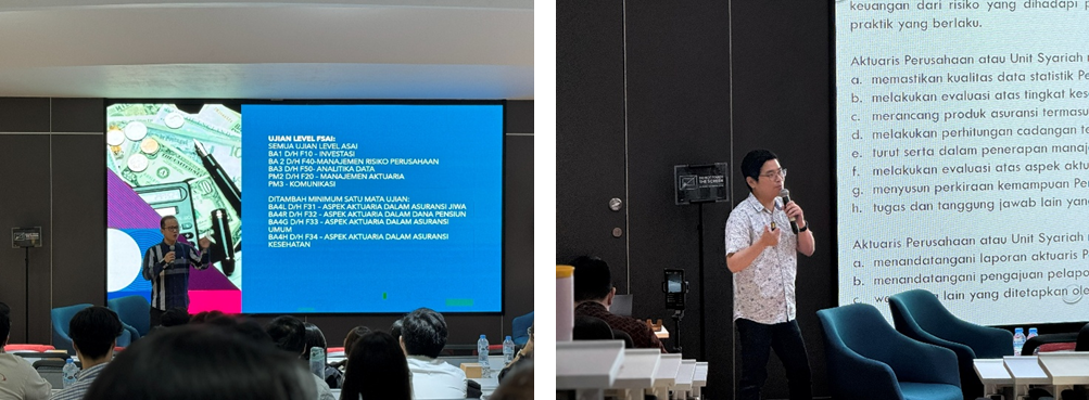 Melengkapi diskusi, Bapak Yudha Wijaya Saputra membahas dari sisi bisnis perusahaan asuransi serta pentingnya kode etik yang harus dipegang teguh oleh seorang aktuaris. Menghadapi tantangan masa depan seperti perkembangan AI, Yudha menegaskan bahwa skill teknis seperti coding dan penguasaan Excel yang mumpuni menjadi krusial bagi aktuaris untuk tetap relevan dan kompetitif di industri.